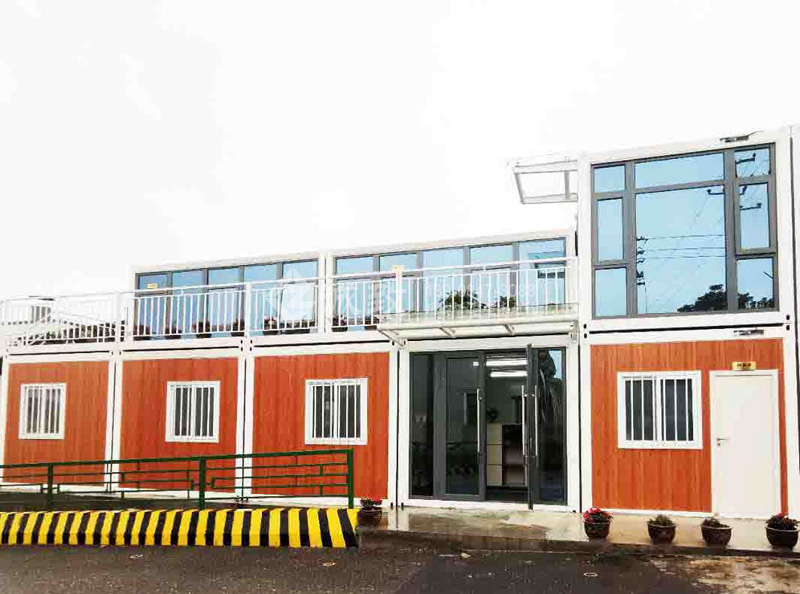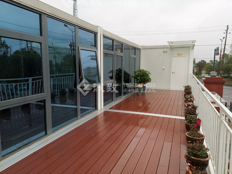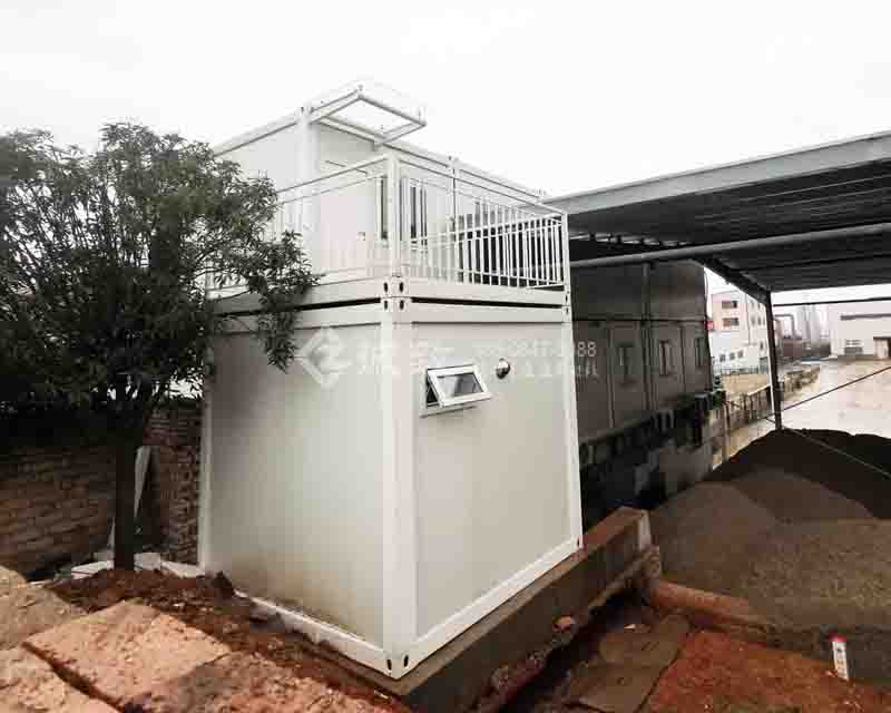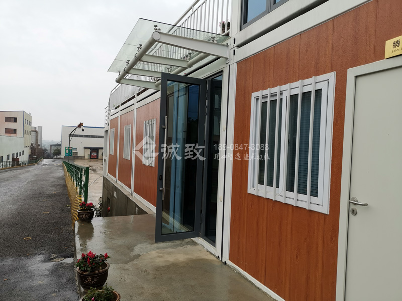 本工程為10個打包箱和一個廁所箱組成,一層有六個打包箱,二層則只有四個打包箱,錯落放置,整個設(shè)計巧妙,二層多余空間剛好作為觀景平臺,地上鋪上了新型環(huán)保、防水、防潮、防火的木塑地板,再配上深藍色的玻璃幕墻,從外觀上看整片外墻猶如一面鏡子,將天空等周圍環(huán)境景色映入其中,光線變化時,影像色彩斑斕、變化無窮,還有白色的欄桿,美麗至極,深受客戶們的贊美。我們的產(chǎn)品不僅外觀靚麗,功能也齊全,一樓銷售部、行政部、生產(chǎn)部、保安室,二樓研發(fā)部、會議室、董事長室、觀景臺,外加一個廁所,麻雀雖小,五臟俱全,功能區(qū)間的合理安排,大大提高了工作效率。