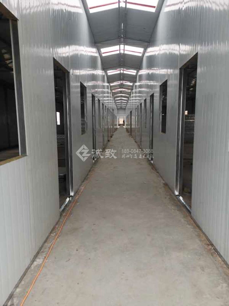 面對面的板房過道屋面采用透明瓦與100mm彩鋼夾芯巖棉瓦鑲嵌的特殊工藝,讓過道不再陰暗。