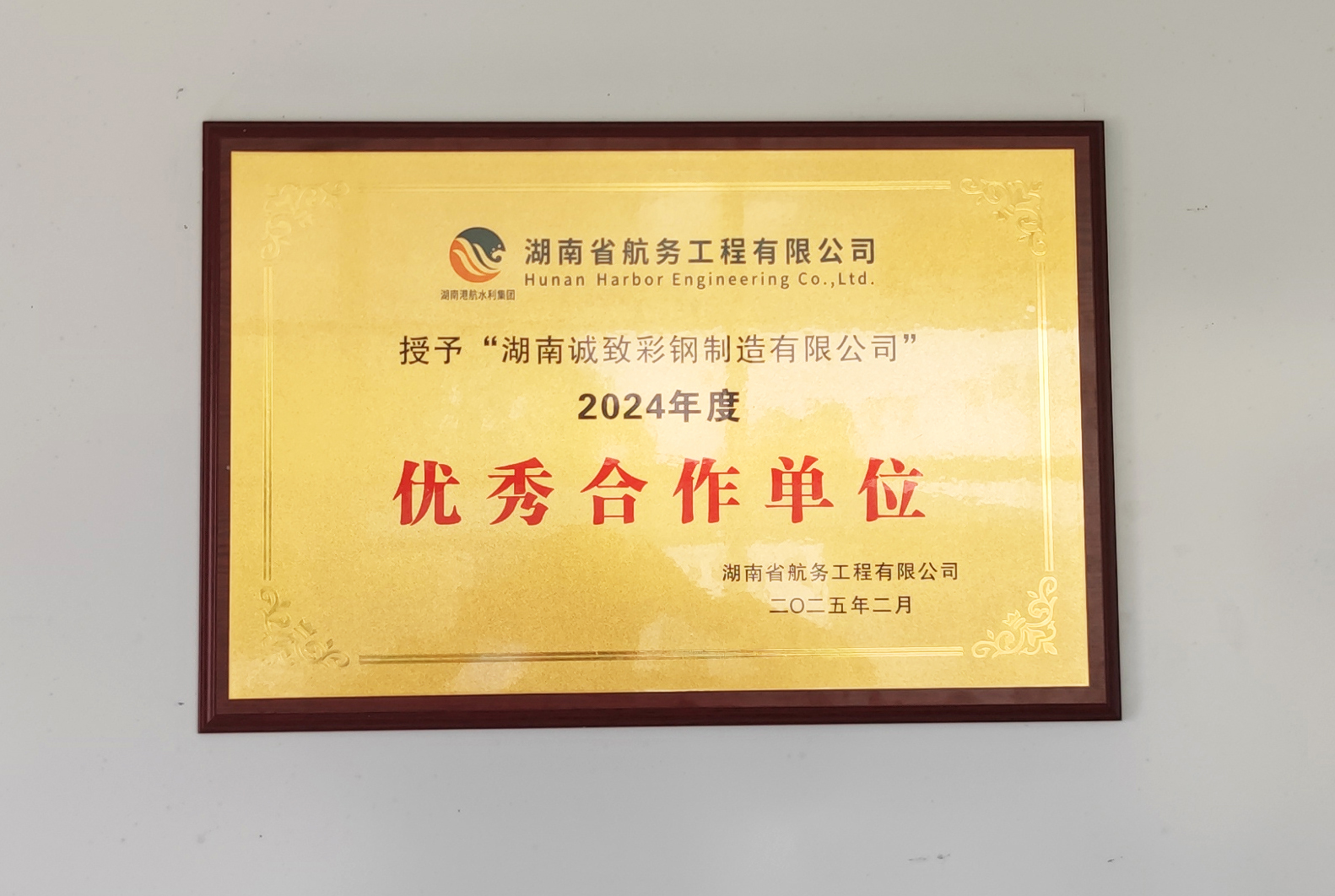 2025年2月18日,湖南誠致彩鋼制造有限公司憑借優質高效的臨建服務,榮獲湖南省航務工程有限公司**“2024年度優秀合作單位”**稱號!這份榮譽不僅是對我們專業能力的認可,更是對“誠致人”匠心服務的高度肯定!