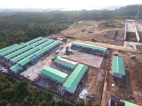 工程介紹: 本項目部駐地工程建有3000平方的標準K式豆綠色活動板房,配備辦公室、試驗室、會議室、宿舍、廚房、大小餐廳、男女浴室與廁所,娛樂室,機修倉庫,籃球場等,功能齊全,全方位打造一個溫馨、高效、美觀的項目部駐地,我們湖南誠致彩鋼贏得了客戶的一致好評。