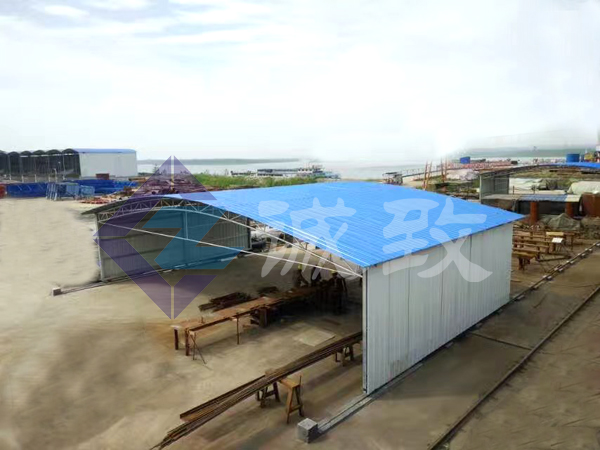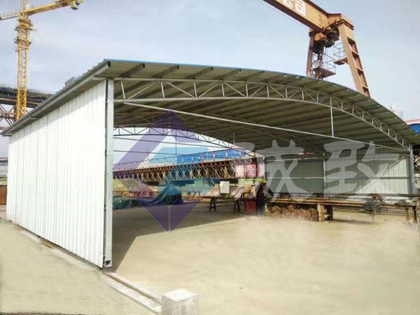 本工程為兩個(gè)可移動(dòng)式鋼筋加工棚,總共300多平方,移動(dòng)棚跨度達(dá)15米,側(cè)面封板,采用鐵軌做軌道,為我們湖南誠(chéng)致獨(dú)創(chuàng)的產(chǎn)品,移動(dòng)棚設(shè)計(jì)新穎,使用方便,四人可輕松推動(dòng),深得客戶喜歡,后來客戶下單讓我們?cè)僮鰞蓚(gè)類似的移動(dòng)棚。
